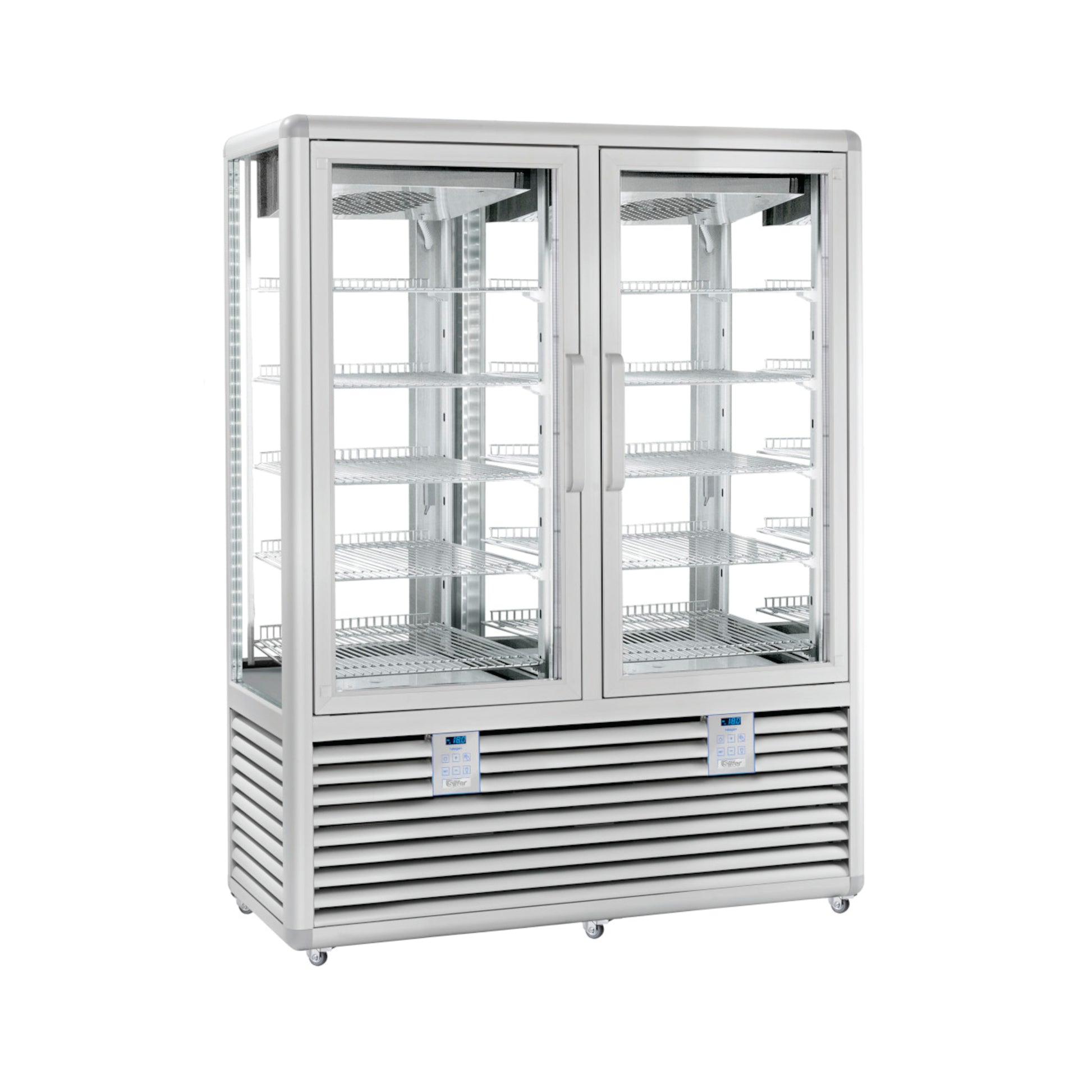 Armários de vidro nos quatro lados com iluminação LED padrão em ambos os lados. Com controle digital de temperatura em ecrã sensível ao toque.