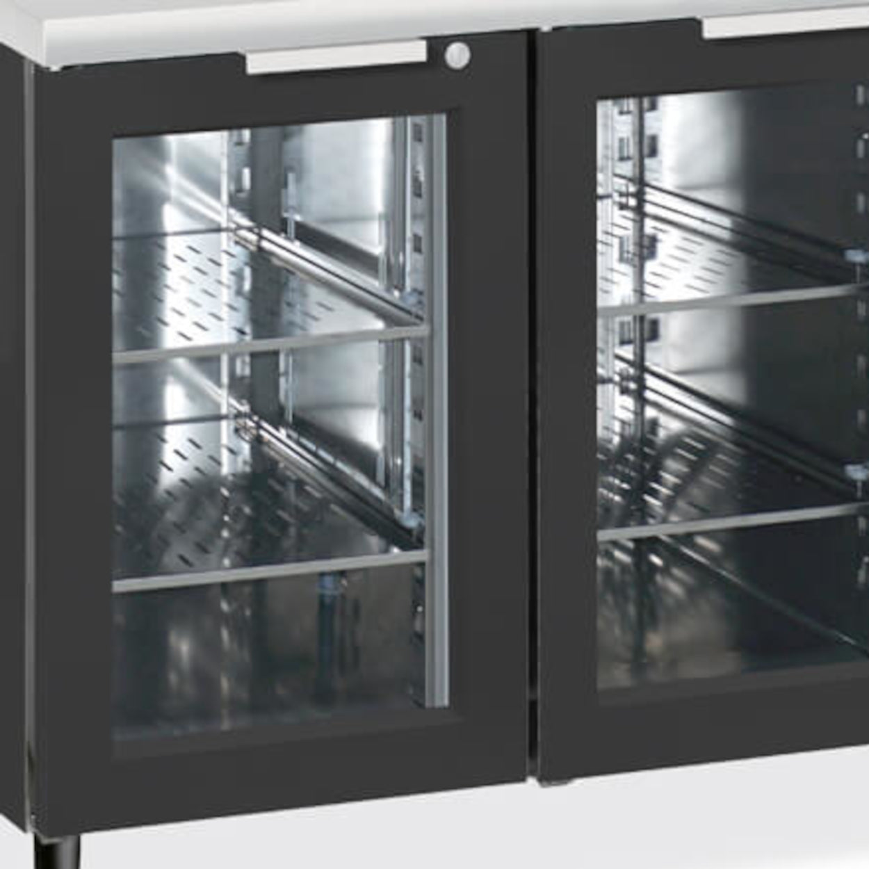 O balcão L4 é um equipamento essencial para qualquer bar ou cafetaria, apresentando um design elegante e compacto que se destaca para um arrefecimento eficiente das garrafas. O sistema de estantes do balcão foi projetado para acomodar até sete prateleiras de 40x48 cm por porta, garantindo amplo espaço de armazenamento. Possui sistema de degelo automático fora do ciclo, complementado por mecanismo de evaporação da água de degelo, que, aliado a grandes evaporadores estrategicamente posicionados atrás dos montantes das portas, garantem um resfriamento consistente. Vem também equipado com um refrigerante natural R290 e mantém uma faixa de temperatura operacional de +4 °C a +8 °C.