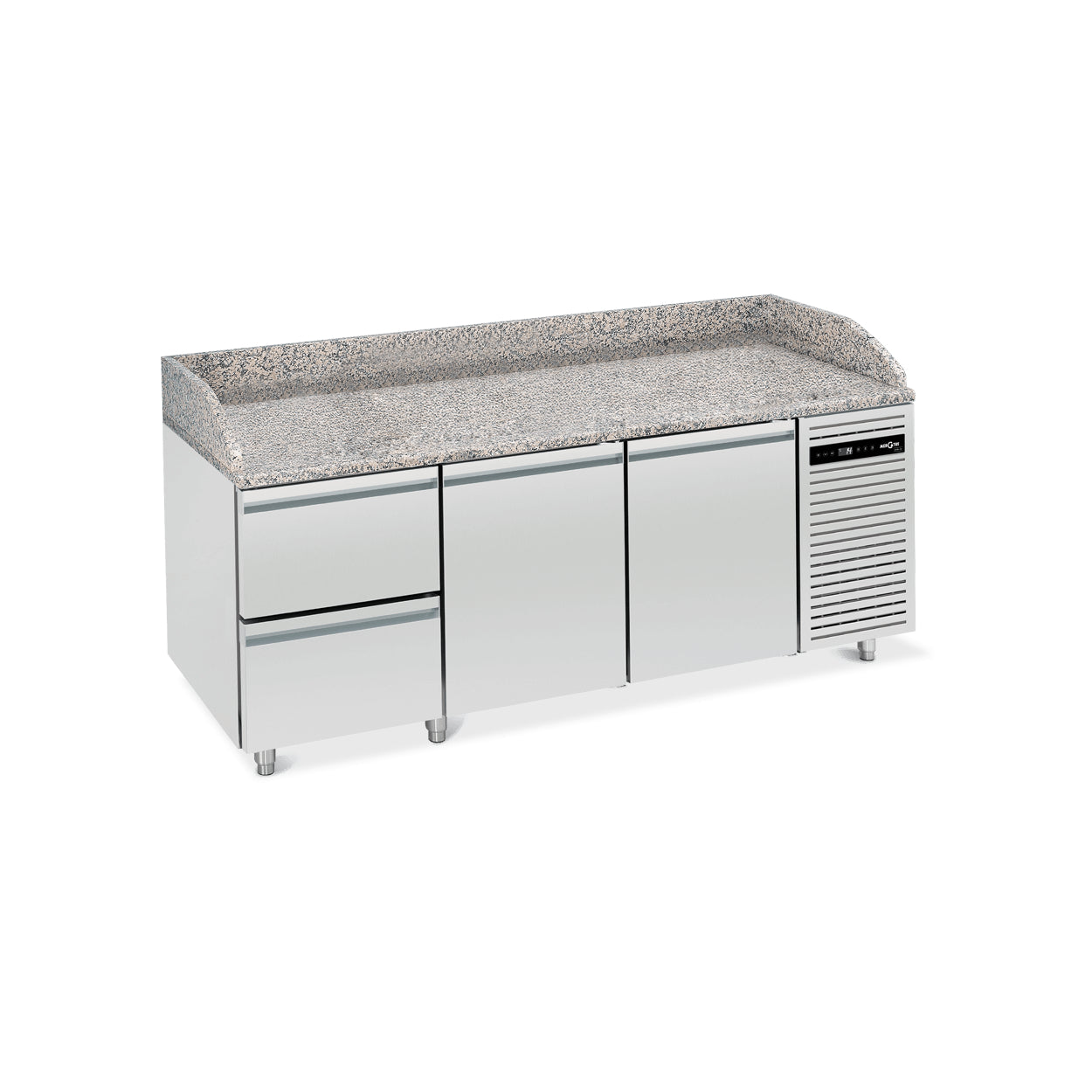 A bancada de preparação L6 é o sonho de qualquer pizzaiolo, combinando perfeitamente forma e função para criar o espaço perfeito para a preparação de pizza. Com a sua robusta bancada de granito e convenientes prateleiras sob o balcão, mantém ingredientes essenciais e massa ao alcance do braço. A construção monobloco em aço inoxidável da mesa e o controle preciso da temperatura, variando de +1 °C a +4 °C, garantem que os produtos permaneçam frescos e prontos para uso. O controlador eletrônico com display digital permite fácil monitoramento e ajuste, enquanto a escolha dos modos de resfriamento oferece versatilidade para se adequar a qualquer receita. Projetado pensando na praticidade, o L6 possui pernas ajustáveis e racks removíveis, tornando-o tão adaptável quanto confiável. Esta mesa de preparação não é apenas um equipamento; é a base de uma cozinha eficiente e de alto desempenho.