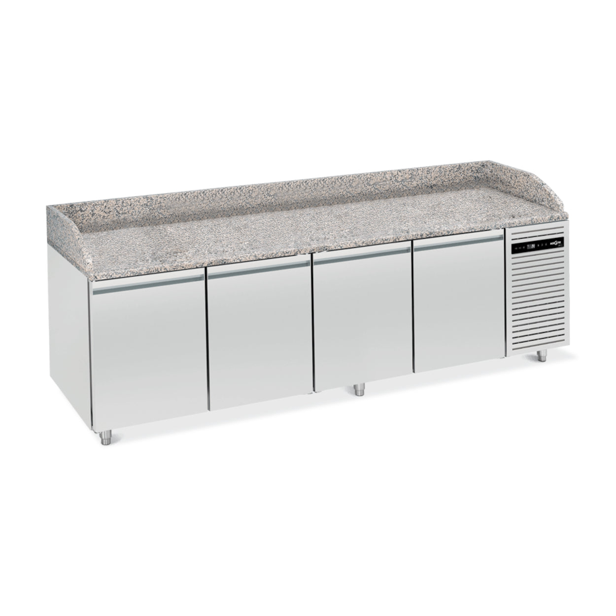 A bancada de preparação L6 é o sonho de qualquer pizzaiolo, combinando perfeitamente forma e função para criar o espaço perfeito para a preparação de pizza. Com a sua robusta bancada de granito e convenientes prateleiras sob o balcão, mantém ingredientes essenciais e massa ao alcance do braço. A construção monobloco em aço inoxidável da mesa e o controle preciso da temperatura, variando de +1 °C a +4 °C, garantem que os produtos permaneçam frescos e prontos para uso. O controlador eletrônico com display digital permite fácil monitoramento e ajuste, enquanto a escolha dos modos de resfriamento oferece versatilidade para se adequar a qualquer receita. Projetado pensando na praticidade, o L6 possui pernas ajustáveis e racks removíveis, tornando-o tão adaptável quanto confiável. Esta mesa de preparação não é apenas um equipamento; é a base de uma cozinha eficiente e de alto desempenho.