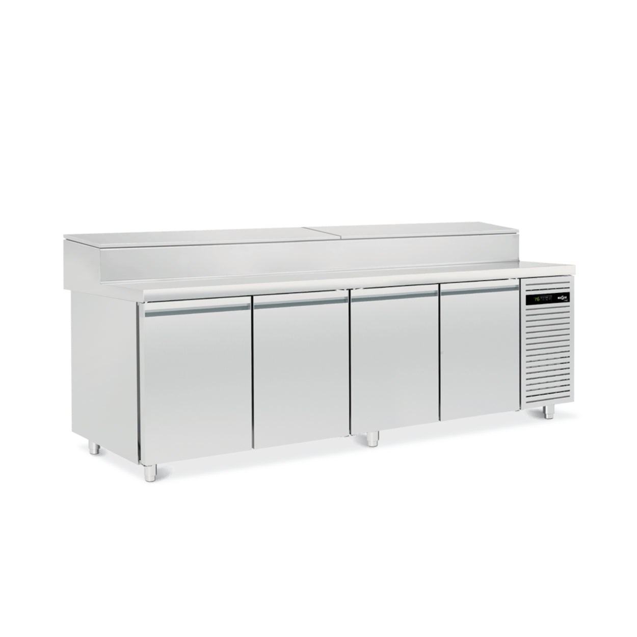A bancada de preparação refrigerada S3 surge como o auge da conveniência e eficiência para o pizzaiolo exigente. O seu design é uma mistura harmoniosa de praticidade e inovação, contando com uma bancada alta com cuba refrigerada e tampa isolada que simplifica as operações diárias, eliminando a necessidade de armazenar panelas GN 1/3 separadamente. A construção monocoque da estação em aço inoxidável de qualidade alimentar garante uma temperatura operacional estável, essencial para a segurança alimentar. Os circuitos duplos de resfriamento, juntamente com a opção de resfriamento estático ou de tiragem forçada, proporcionam flexibilidade no gerenciamento da temperatura, enquanto o controlador eletrónico com display digital oferece precisão ao toque de um botão. A bancada robusta, as pernas ajustáveis e o sistema de estantes facilmente removível sublinham o compromisso da estação com a durabilidade e a facilidade de utilização. Além disso, conta ainda com ventilação frontal e um design inteligente, o S3 não é apenas um equipamento; é uma parte central da cozinha pronta para atender às altas demandas da preparação profissional de pizza.