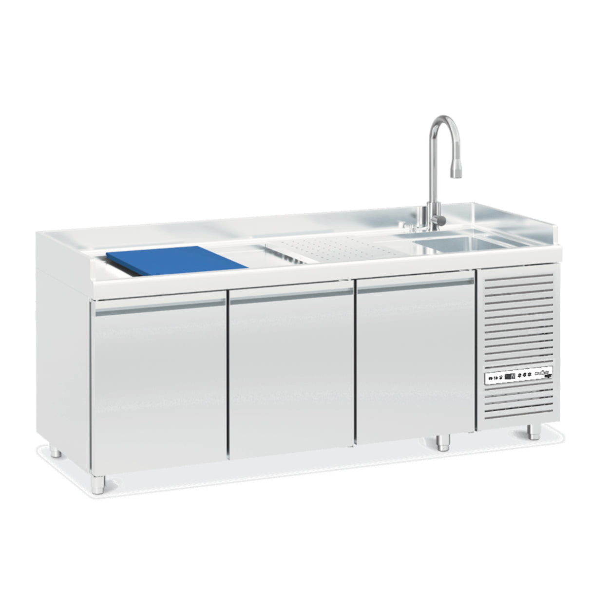 A bancada de preparação refrigerada P3 é o sonho de qualquer artista culinário, integrando perfeitamente uma variedade de recursos para facilitar o preparo de pratos frescos. A sua bancada, uma combinação harmoniosa de funcionalidade e design, inclui bocais laterais e uma área recuada que conduz a um lavatório, complementada por uma tábua de cortar em polietileno resistente e uma versátil torneira misturadora com jato extraível.