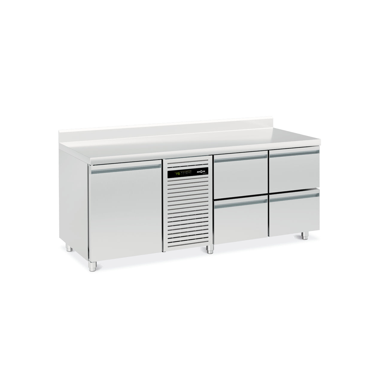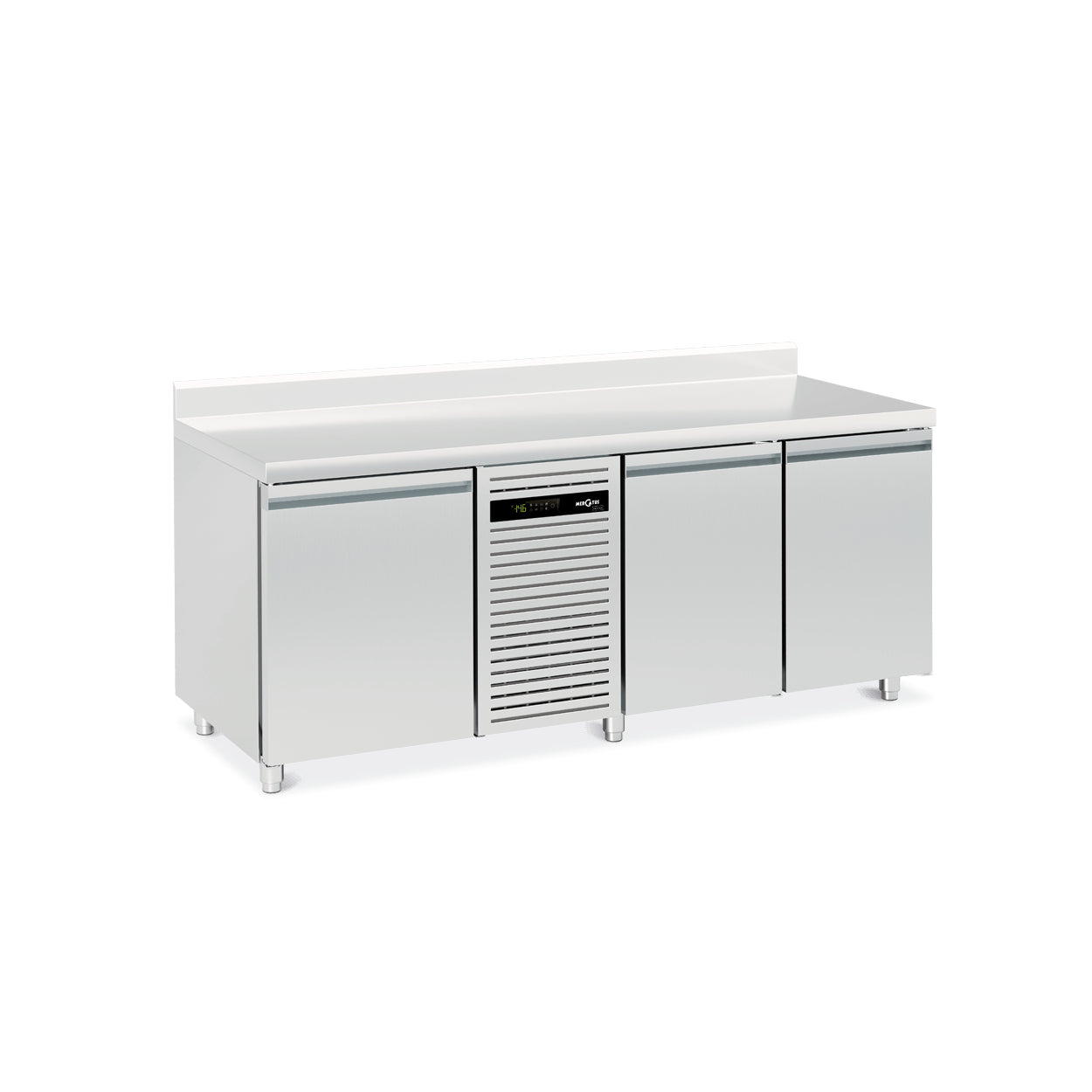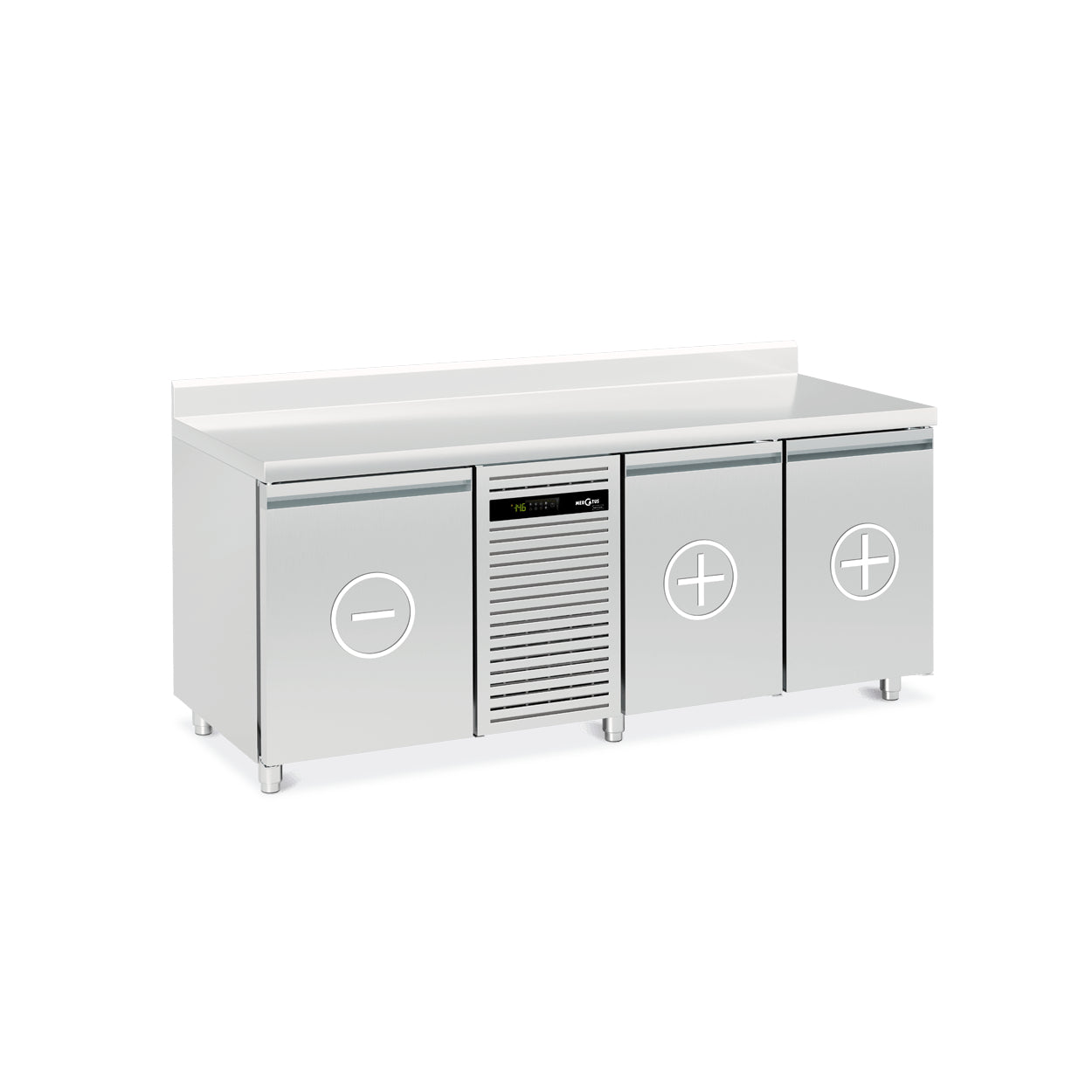A bancada combi com temperatura dupla é uma solução versátil e inovadora para cozinhas que necessitam de conservar de forma eficiente alimentos congelados e refrigerados. O seu design exclusivo apresenta duas secções distintas, com uma porta única para itens congelados e uma porta dupla para produtos refrigerados, tudo dentro de uma elegante estrutura monocoque de aço inoxidável.