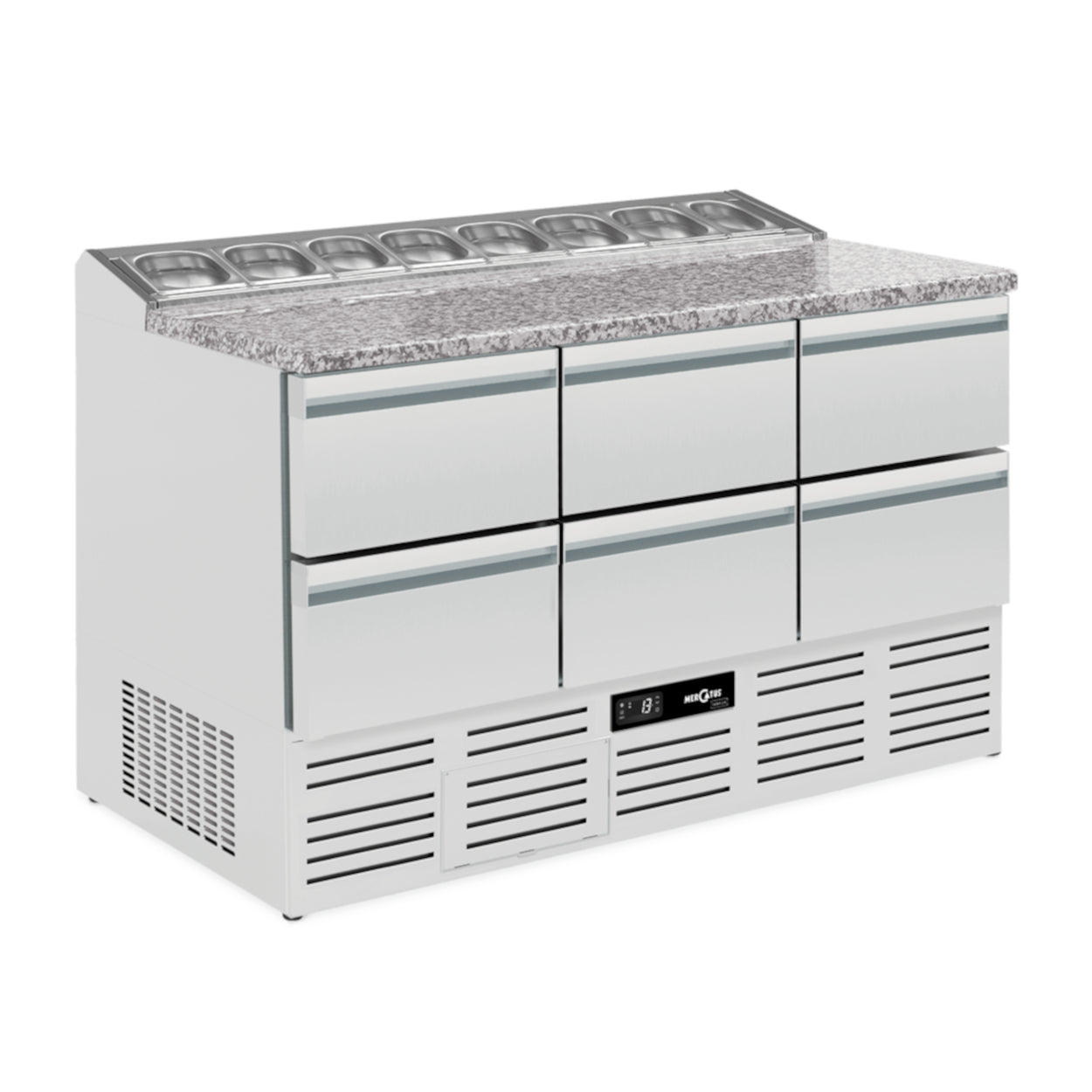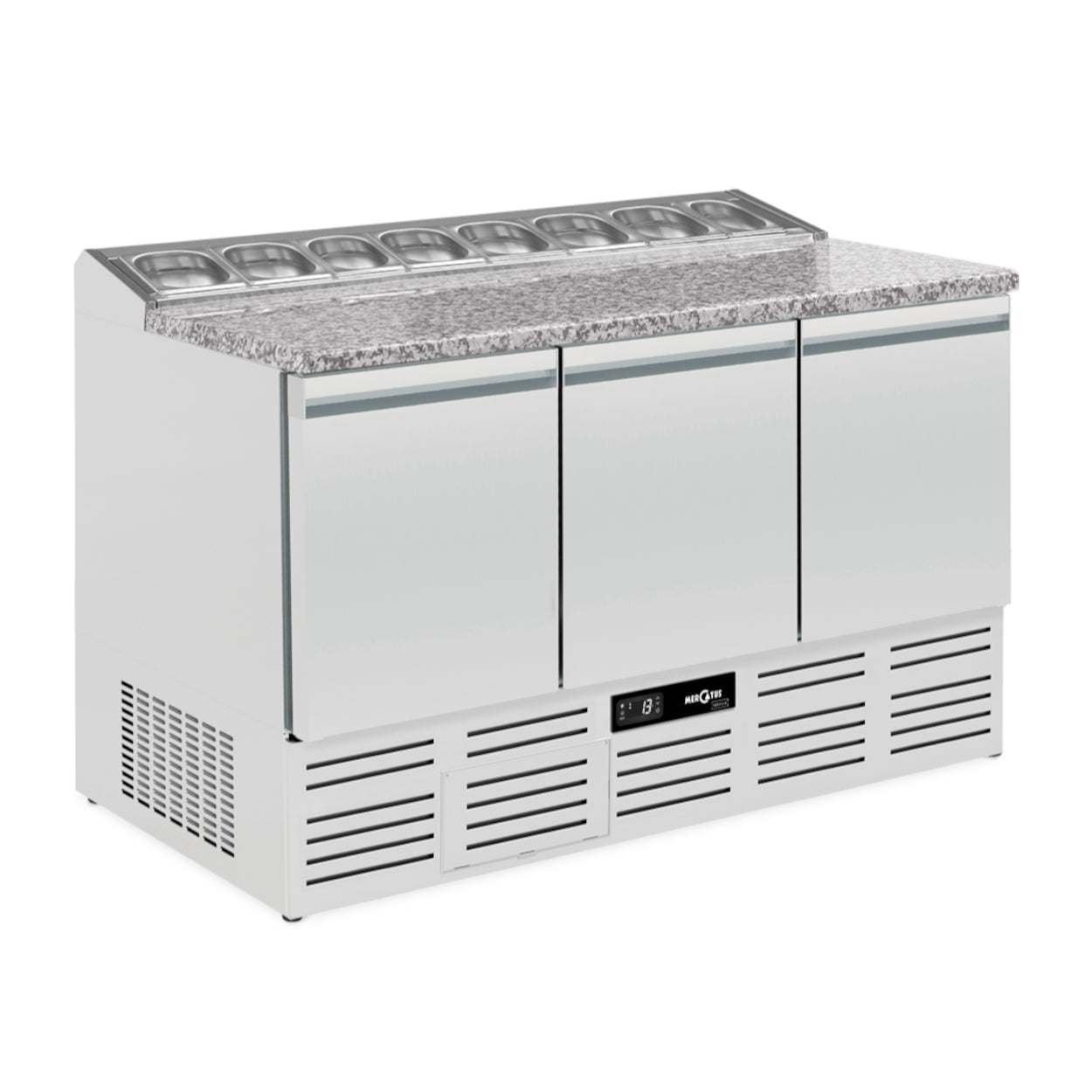 A mesa compacta de preparação de pizza é um recurso essencial para qualquer pizzaiolo, combinando funcionalidade com design elegante. A sua robusta bancada em granito, completa com cavidade elevada para containers GN 1/6, oferece amplo espaço para confeccionar a pizza perfeita. A construção monocoque da mesa garante durabilidade e segurança alimentar, com temperatura de funcionamento que mantém os ingredientes frescos. Recursos avançados como o controlador eletrónico e o sistema de resfriamento por tiragem forçada mantêm condições ideais, enquanto o design prático inclui pés niveladores de náilon e uma estrutura de aço inoxidável fácil de limpar e ajustar. Esta mesa de preparação não é apenas um equipamento; é a base da eficiência e excelência culinária em qualquer empreendimento de fabricação de pizza.
