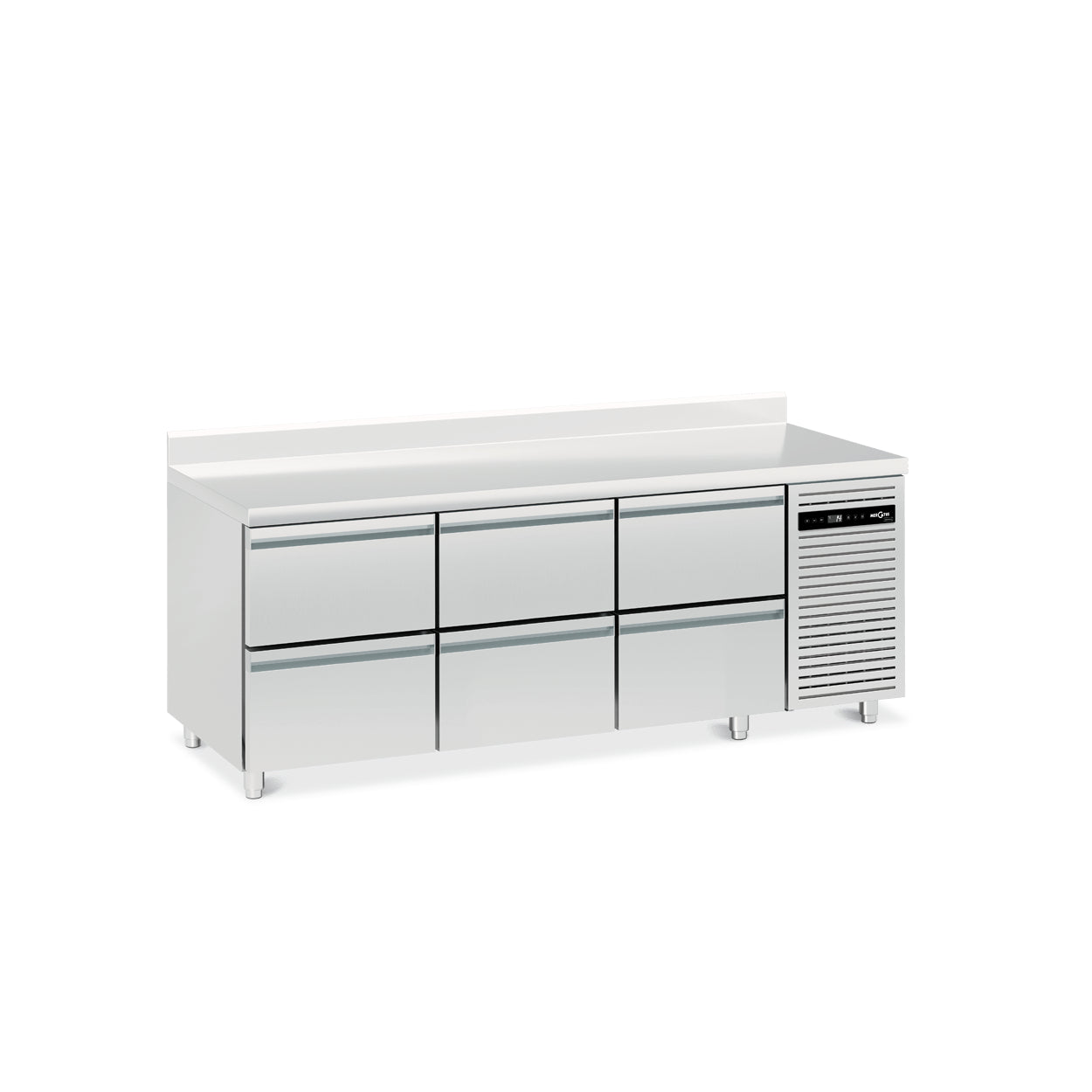 A bancada de pastelaria L3 é um equipamento essencial para padarias tradicionais e médias, oferecendo uma construção monocoque robusta em aço inoxidável de qualidade alimentar. Projetado para atender aos rigorosos requisitos de armazenamento refrigerado da indústria de panificação, opera eficientemente em uma faixa de temperatura de +1 °C a +4 °C. O seu design inovador inclui um sistema de refrigerante natural R290 e um sistema de estantes versátil capaz de acomodar várias bandejas de padaria. Possui um sistema de degelo automático que opera fora do ciclo, complementado por uma opção de resfriamento estático ou de tiragem forçada para garantir um desempenho ideal. Um grande evaporador estrategicamente colocado de forma a maximizar o espaço, enquanto o controlador eletrónico possui um display digital e um teclado de toque plano e fácil de usar. A altura do balcão é ajustável graças aos seus pés telescópicos em aço inoxidável, e a espessura da bancada garante durabilidade e conformidade com as normas de segurança alimentar.