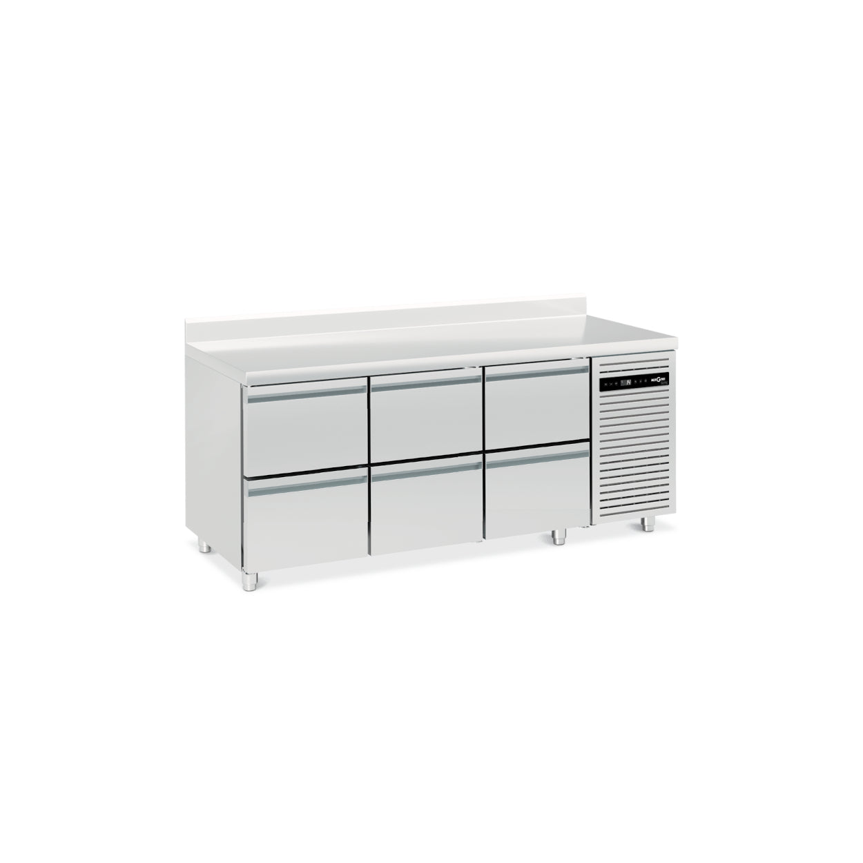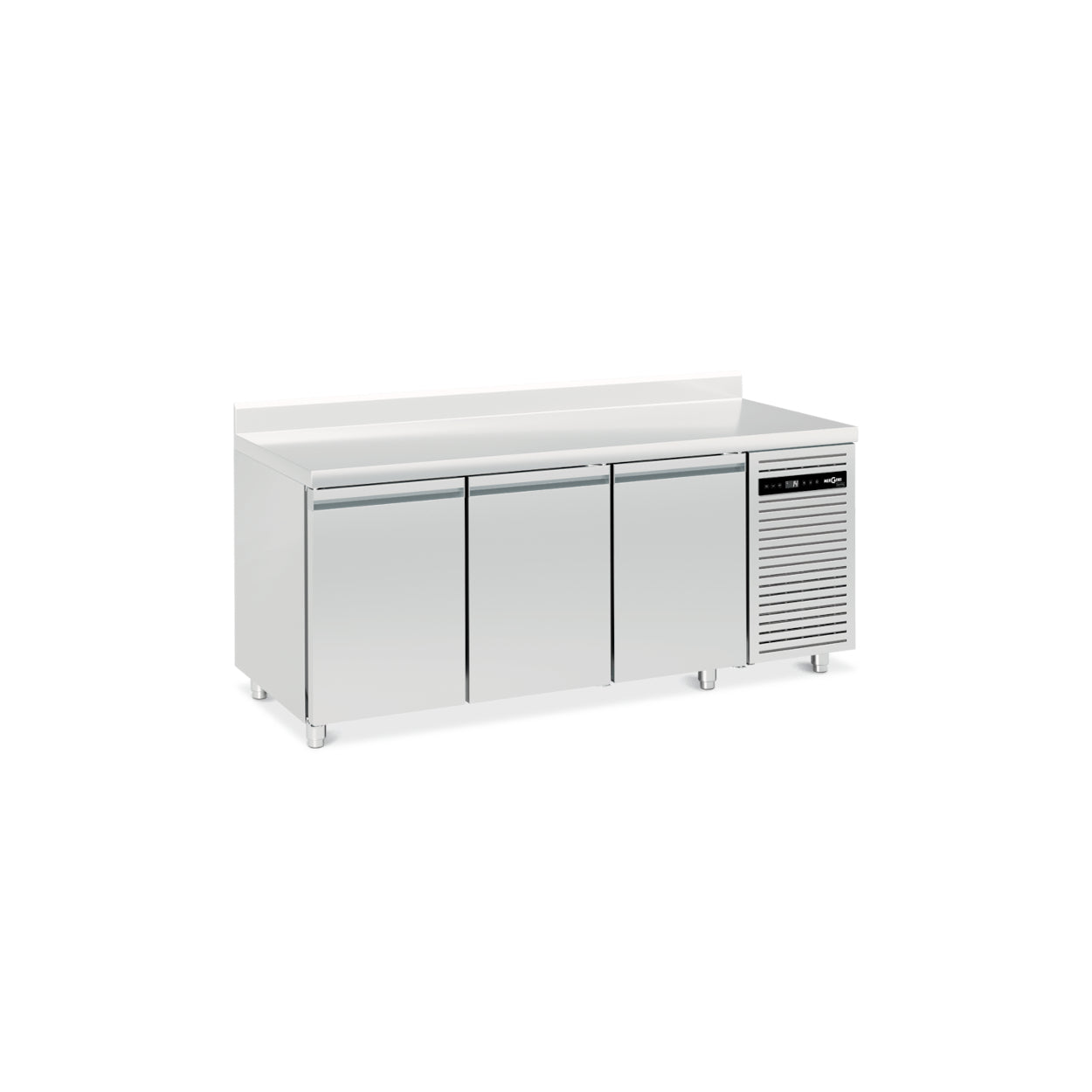 A unidade L2 destaca-se como o complemento por excelência das cozinhas profissionais, apresentando um design monocoque fabricado em aço inoxidável de qualidade alimentar que promete durabilidade e higiene. A sua capacidade de manter uma elevada humidade relativa, graças aos grandes evaporadores entre as portas, juntamente com a flexibilidade para alternar entre os modos de refrigeração estática ou ventilada, garantem que satisfaz as diversas necessidades dos profissionais da culinária. A bancada opera dentro de uma faixa de temperatura de +1 °C a +5 °C, utilizando um refrigerante natural R290 para um desempenho ecologicamente correto. O sistema de degelo automático, que também cuida da evaporação da água do degelo, aumenta a comodidade. O controlador eletrónico simplifica a operação com o seu display digital e teclado de toque plano. Além disso, os controles deslizantes em forma de 'E'