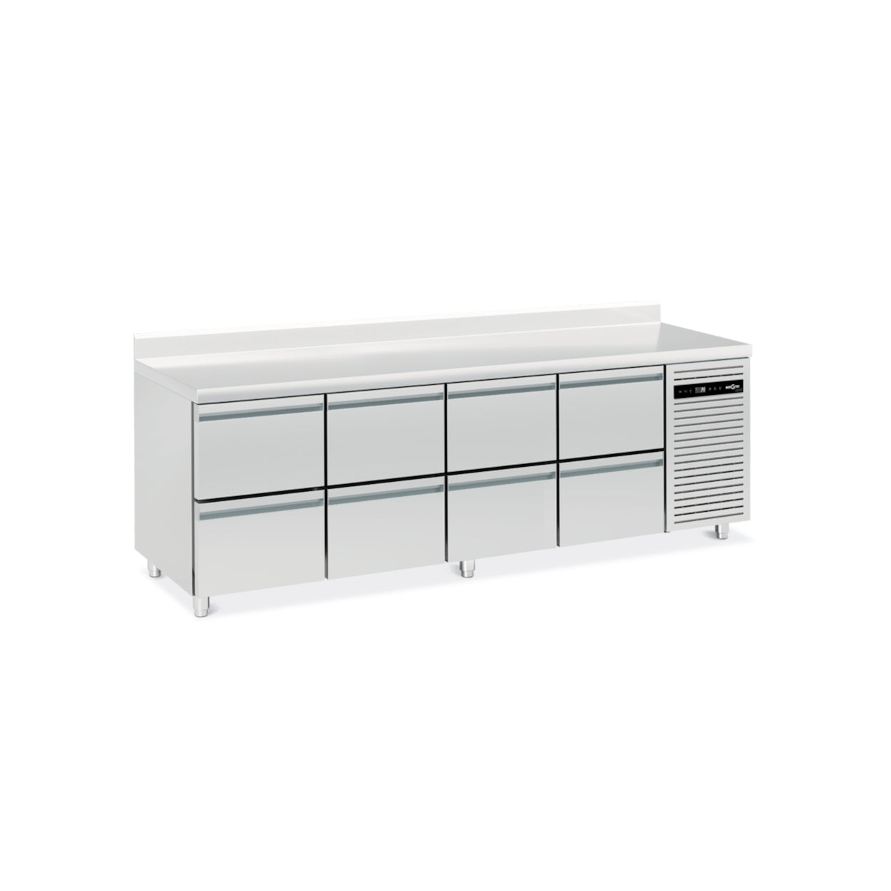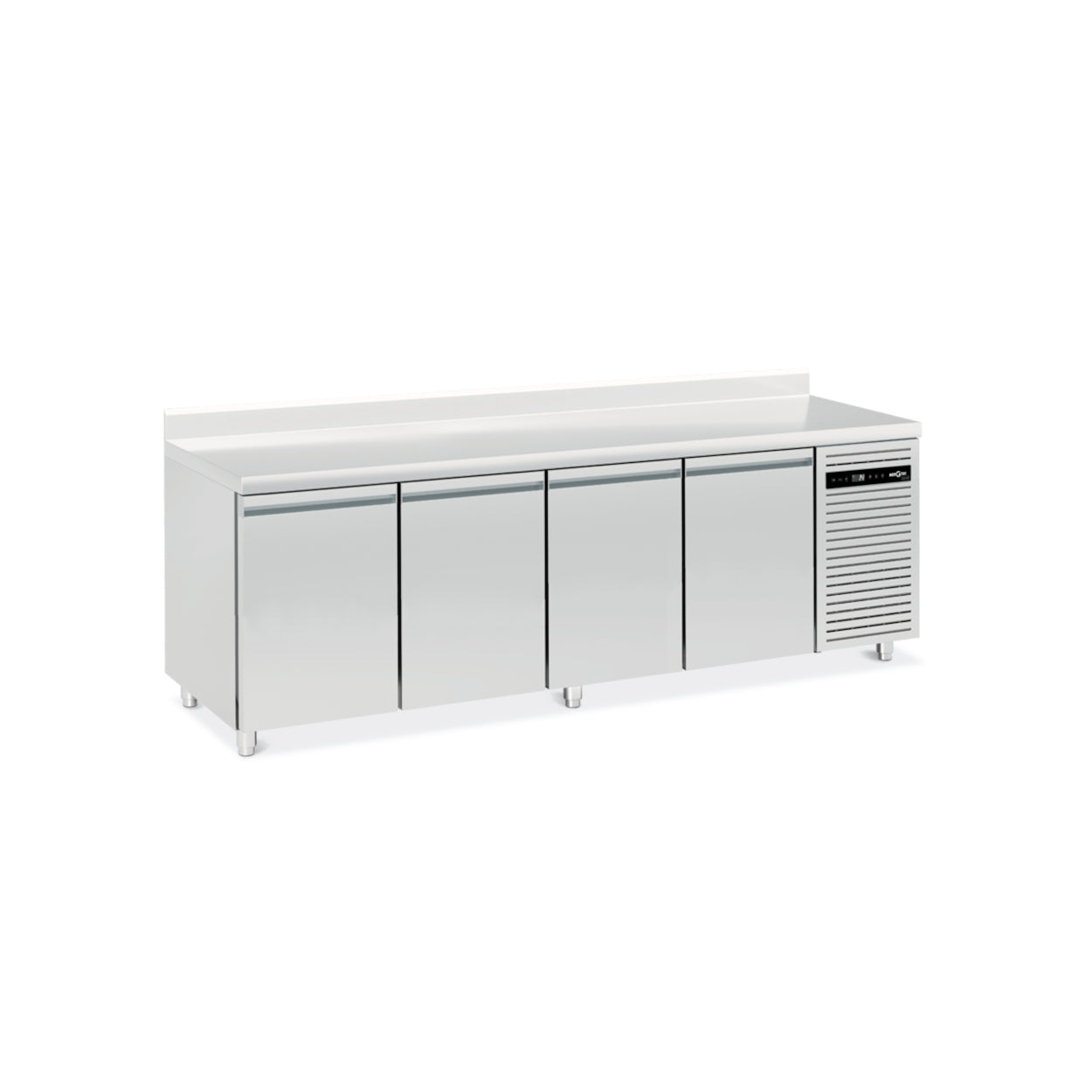 A unidade L2 destaca-se como o complemento por excelência das cozinhas profissionais, apresentando um design monocoque fabricado em aço inoxidável de qualidade alimentar que promete durabilidade e higiene. A sua capacidade de manter uma elevada humidade relativa, graças aos grandes evaporadores entre as portas, juntamente com a flexibilidade para alternar entre os modos de refrigeração estática ou ventilada, garantem que satisfaz as diversas necessidades dos profissionais da culinária. A bancada opera dentro de uma faixa de temperatura de +1 °C a +5 °C, utilizando um refrigerante natural R290 para um desempenho ecologicamente correto. O sistema de degelo automático, que também cuida da evaporação da água do degelo, aumenta a comodidade. O controlador eletrónico simplifica a operação com o seu display digital e teclado de toque plano. Além disso, os controles deslizantes em forma de 'E'