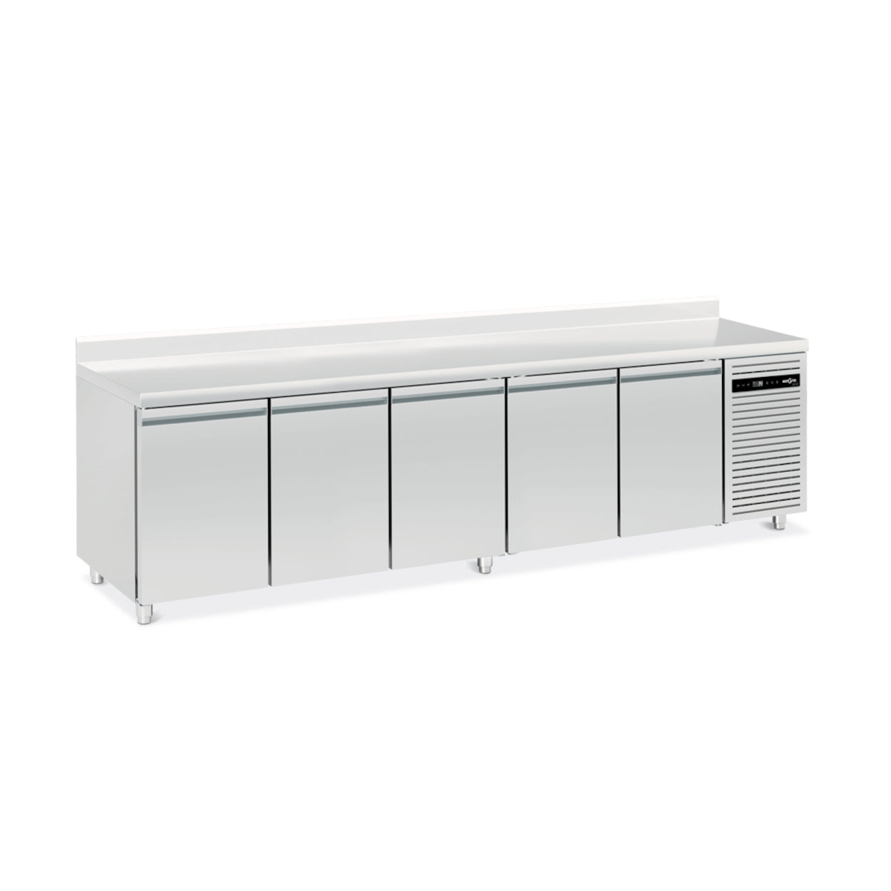 A unidade L2 destaca-se como o complemento por excelência das cozinhas profissionais, apresentando um design monocoque fabricado em aço inoxidável de qualidade alimentar que promete durabilidade e higiene. A sua capacidade de manter uma elevada humidade relativa, graças aos grandes evaporadores entre as portas, juntamente com a flexibilidade para alternar entre os modos de refrigeração estática ou ventilada, garantem que satisfaz as diversas necessidades dos profissionais da culinária. A bancada opera dentro de uma faixa de temperatura de +1 °C a +5 °C, utilizando um refrigerante natural R290 para um desempenho ecologicamente correto. O sistema de degelo automático, que também cuida da evaporação da água do degelo, aumenta a comodidade. O controlador eletrónico simplifica a operação com o seu display digital e teclado de toque plano. Além disso, os controles deslizantes em forma de 'E'