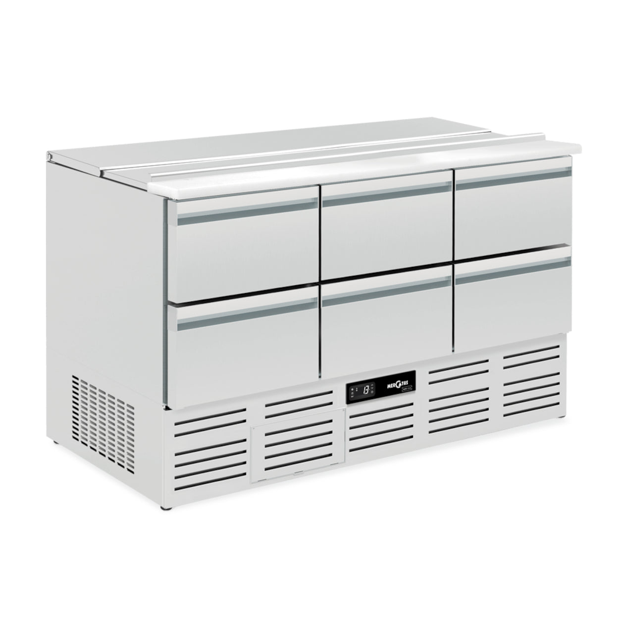 A bancada R1 é uma aliada do profissional da culinária, meticulosamente projetada para manter os ingredientes de saladas e pratos frios no seu melhor. A tábua de corte integrada, convenientemente posicionada junto à caixa frigorífica, é complementada por uma tampa articulada que garante que os alimentos permanecem protegidos entre utilizações. A sua construção monocoque em aço inoxidável de qualidade alimentar, aliada a uma temperatura de funcionamento mantida entre +2 °C e +8 °C, garante durabilidade e óptima segurança alimentar. A bancada utiliza um refrigerante natural R290 e possui um sistema de degelo automático que gerência com eficiência a água de degelo. O resfriamento por tiragem forçada, o grande evaporador e o controlador eletrônico com display digital e teclado de toque plano contribuem para seu desempenho confiável. A mesa assenta sobre pés niveladores resistentes em aço inoxidável e inclui uma bancada espessa para uma utilização diária rigorosa. Os controles deslizantes em forma de 'E' e as estantes removíveis de aço inoxidável aumentam a sua praticidade, permitindo a fácil organização e manutenção. Com ventilação respiratória frontal, a mesa de preparação R1 foi projetada para fornecer resultados consistentes no ambiente acelerado de cozinhas profissionais.