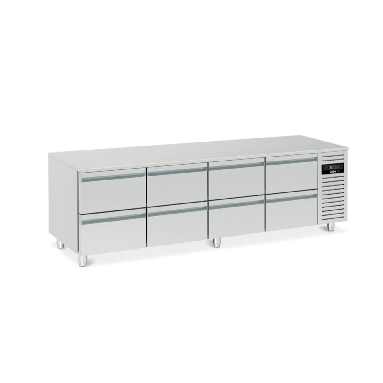 O modelo U3 é uma adição elegante a qualquer cozinha profissional, oferecendo uma base de resfriamento compacta que se integra perfeitamente em configurações de cozimento modulares. Esta base foi projetada para trazer alimentos resfriados bem próximos à área de preparação, aumentando a eficiência ao otimizar o espaço e melhorar o fluxo de trabalho. É particularmente adequado para conservar produtos prontos a cozinhar, mantendo-os a uma temperatura ideal de funcionamento de +1 °C a +5 °C. Fabricado em aço inoxidável monocoque de qualidade alimentar, não só garante robustez, mas também segue os mais altos padrões de higiene. O U3 é ecologicamente correto, utiliza refrigerante natural R290 e possui gavetas GN2/3 que promovem o uso ergonômico. O seu sistema de degelo automático e a evaporação da água de degelo por parada facilitam a manutenção. O sistema de resfriamento por tiragem forçada, juntamente com grandes evaporadores, garantem um desempenho de resfriamento consistente e confiável. O controlador eletrónico, completo com display digital e teclado plano, oferece precisão e facilidade de controle. As pernas ajustáveis em aço inoxidável permitem a personalização da altura, enquanto a bancada em aço inoxidável de qualidade alimentar proporciona uma superfície robusta e limpa para a preparação de alimentos. A ventilação respiratória frontal garante um desempenho confiável mesmo nos ambientes de cozinha mais movimentados. Cada seção vem equipada com uma gaveta GN2/3, projetada para acomodar 1 container GN2/3-200, tornando o U3 uma ferramenta indispensável para chefs que valorizam eficiência, confiabilidade e qualidade em suas criações culinárias.