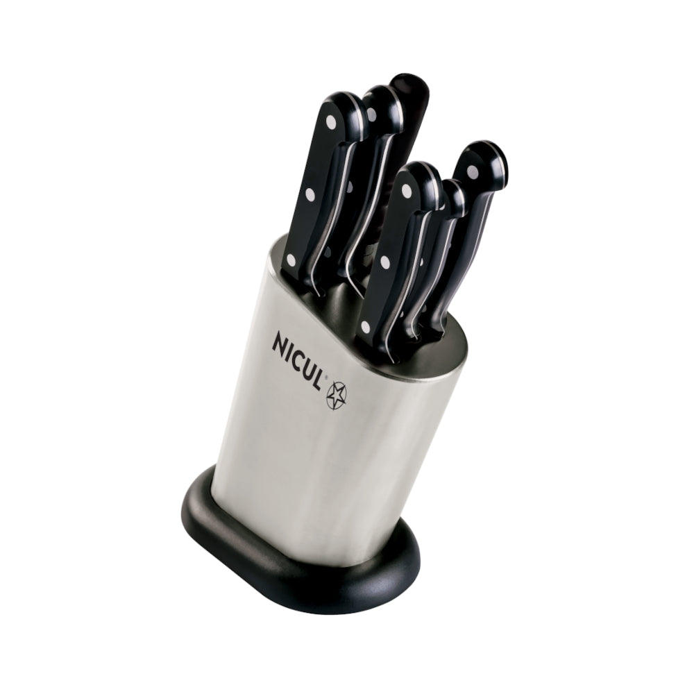 Bloco de arrumação com base em preto, com 5 facas e um fuzil de afiamento.