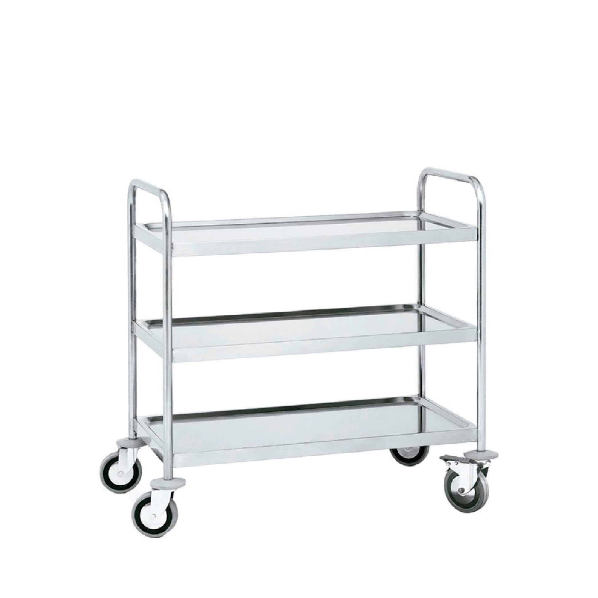 Carro de serviço com estrutura reforçada e aparafusada para cargas até 200Kg, totalmente em aço inoxidável AISI 304 18/10, fornecido montado.