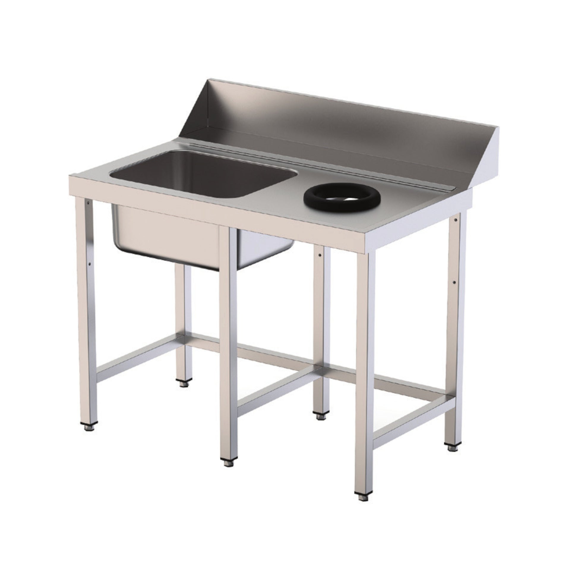 Fabrico em aço inox AISI 304, com pernas em tubo quadrado de 40x40mm e pé regulável e cuba soldada.