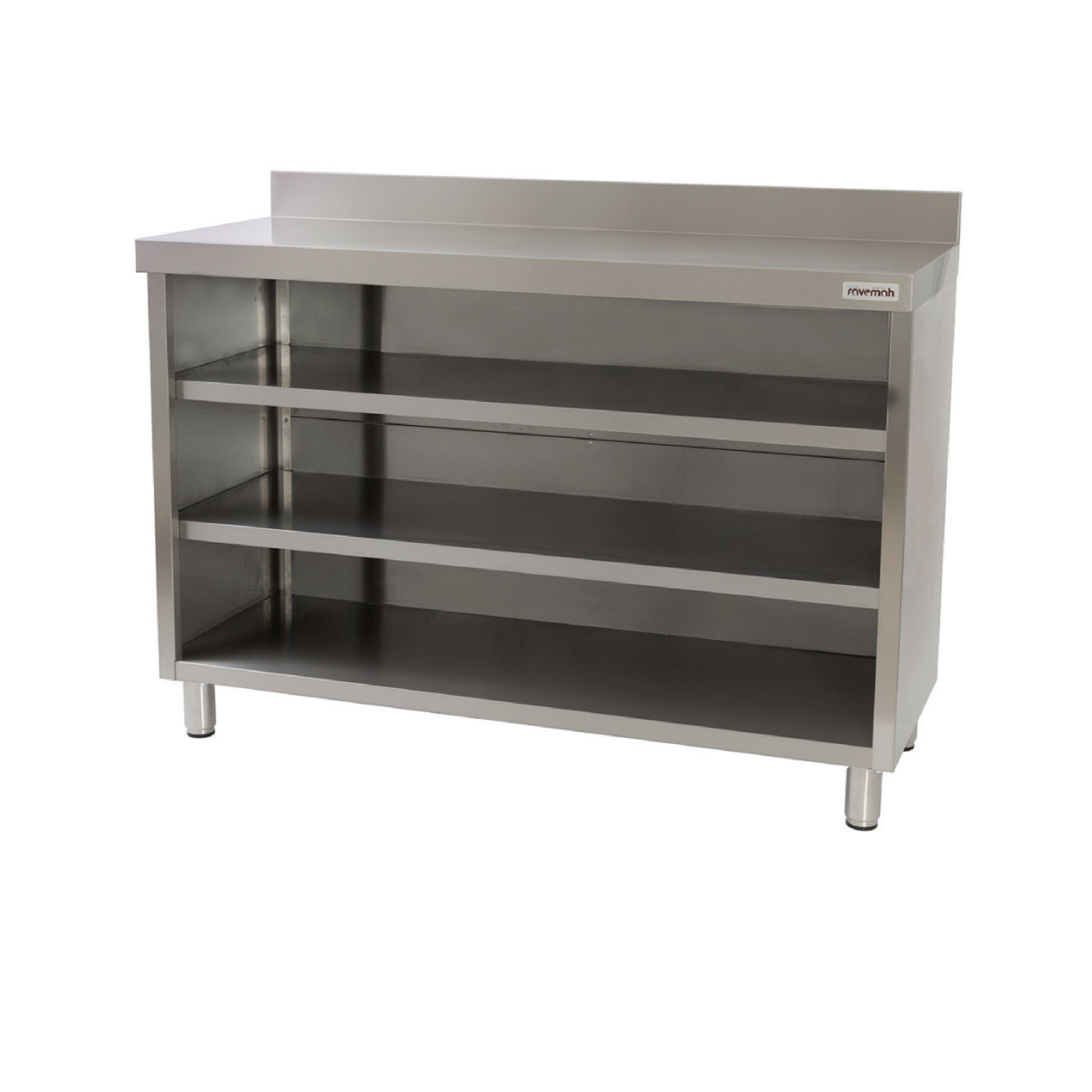 Móvel fabricado inteiramente em aço inoxidável, com alçado traseiro de 100 mm, pés reguláveis em altura e prateleiras intermédias.